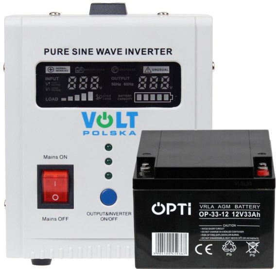 Zestaw do awaryjnego zasilania 33Ah 500W, składający się z akumulatora VOLT POLSKA 12V 33Ah z serii OPTI oraz przetwornicy 12V 300/500W to kompletny zestaw zasilania awaryjnego!